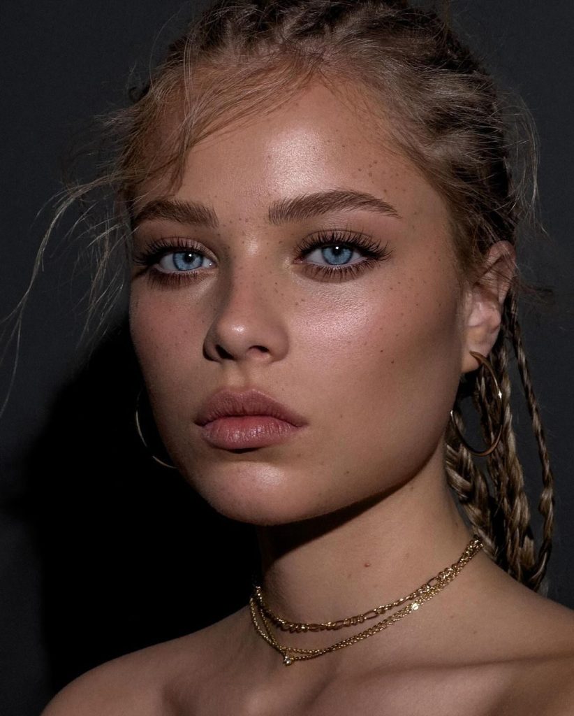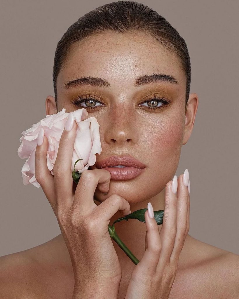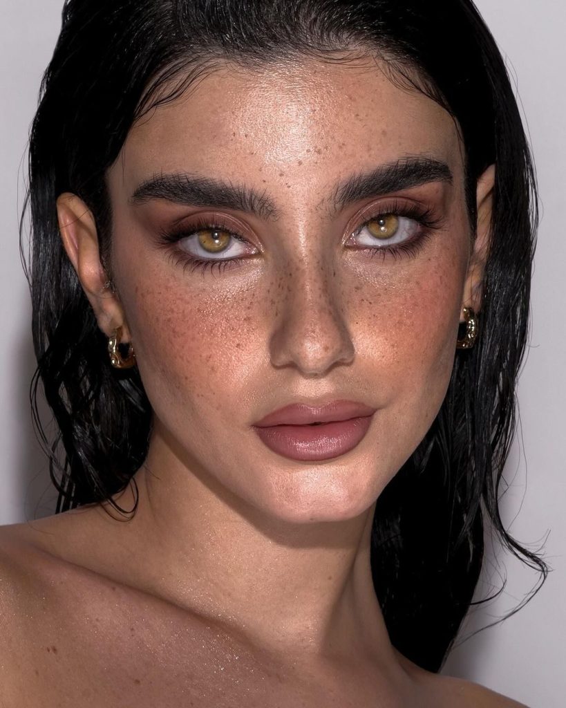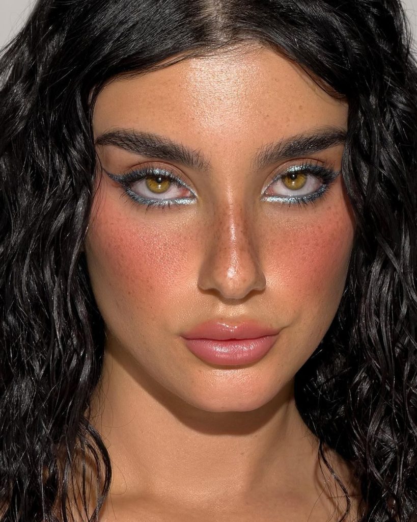 Natural freckles peek through a sheer veil of product, adding personality and charm. A subtle shimmer on the lids mirrors the reflection of evening water, and the whole look feels like it’s just emerged from a sunset swim. It’s bold in its ease, glamorous in its restraint, and unforgettable in its glow.