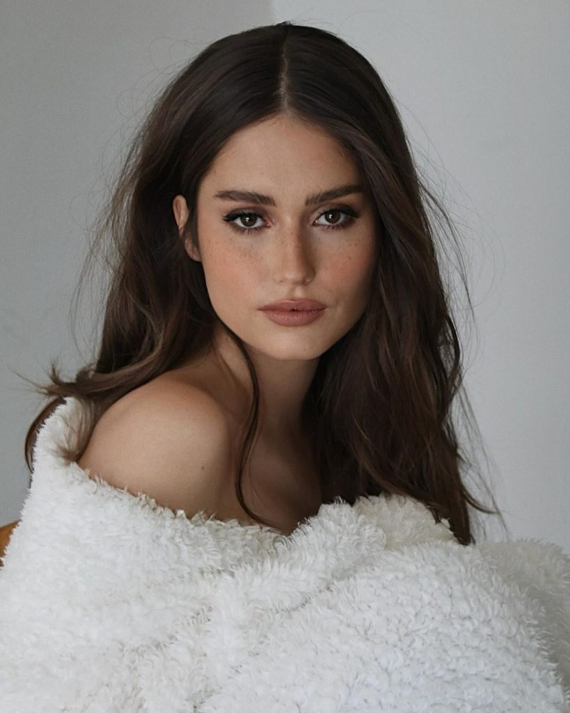 A minimalist masterpiece, this look is pure and airy—an ode to the simplicity of summer days. Her blue eyes sparkle like the clear midday sky, accentuated with the gentlest touch of light eyeshadow.