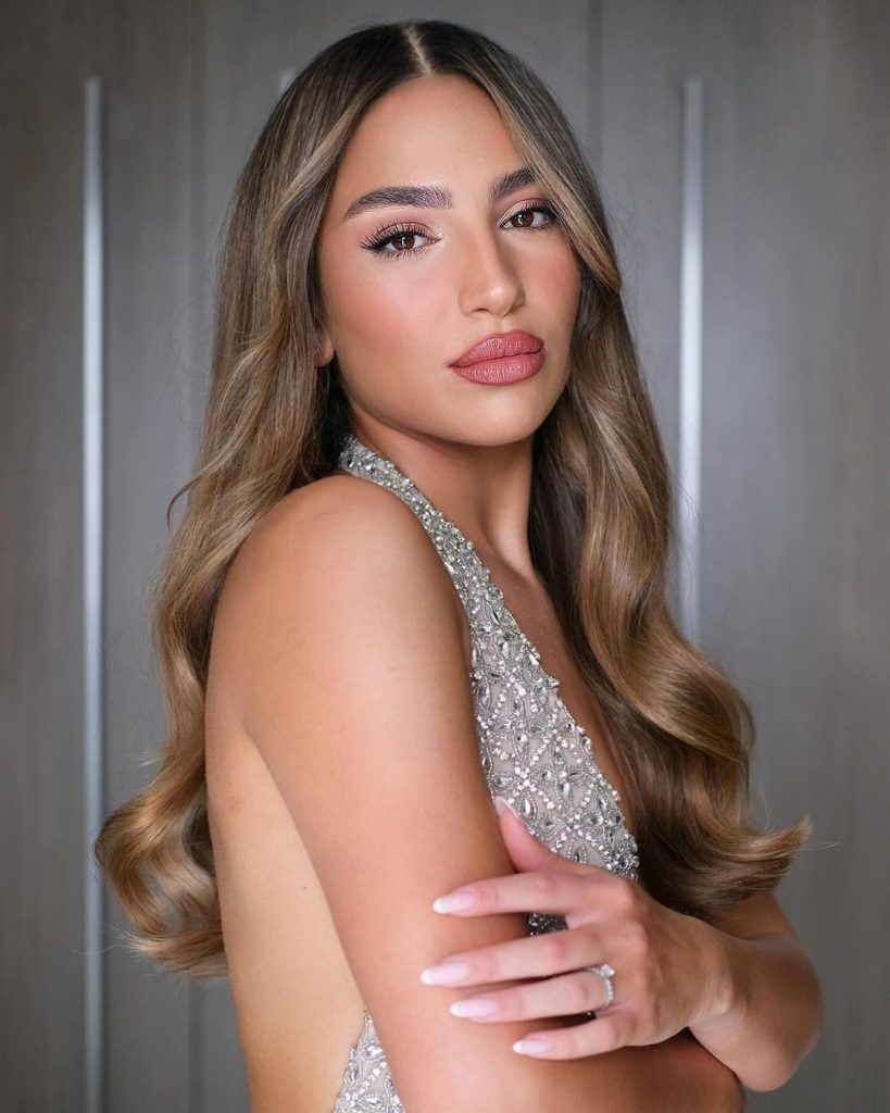 Glossy lips enhance her complexion, giving her a polished yet approachable elegance. Subtle contouring adds dimension without heaviness, and the entire look radiates an effortless charm suited for weddings, rooftop dinners, and elegant twilight gatherings. It’s where breezy ease meets just a hint of summer drama.