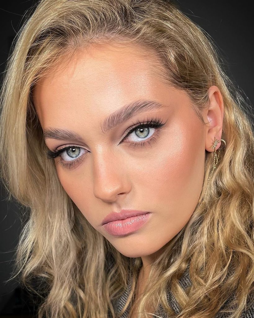 This glowing look captures the dewiness of early morning light, where natural beauty is enhanced by shine and soft warmth. The cheekbones are illuminated with highlighter, making the skin look fresh and kissed by nature.