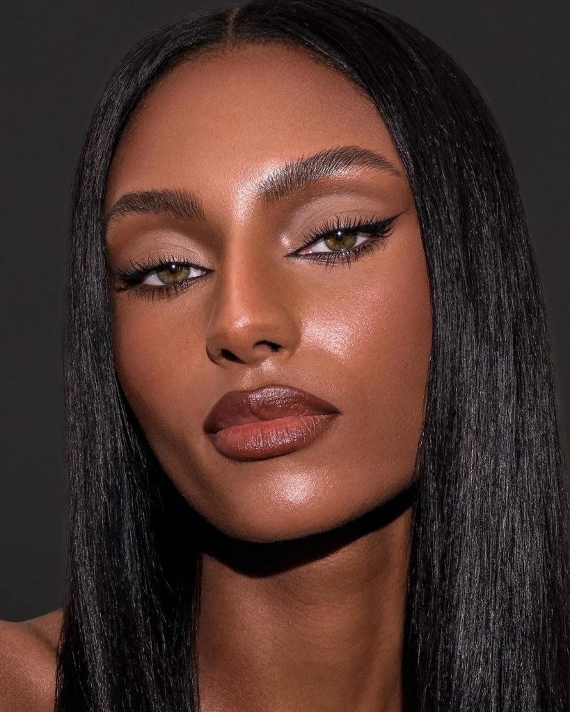 Mysterious and alluring, this look pairs smoky bronze eyes with glistening cheekbones that glow like moonlight on warm skin. Her dark complexion is enhanced with sun-kissed highlighter, making every angle shimmer subtly.