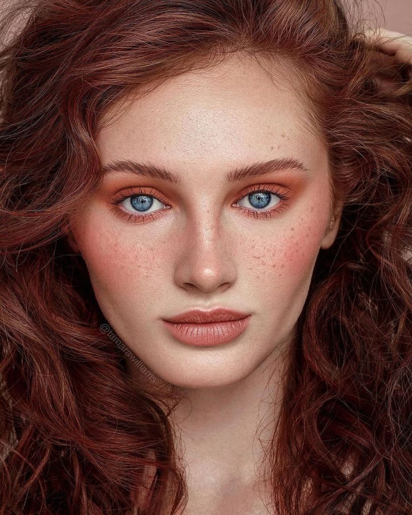 This fiery look mirrors the colors of a summer dusk—rich, warm, and enchanting. Freckles glow like embers across cheeks and nose, while brown eyeshadow adds gentle depth to hypnotic blue eyes.