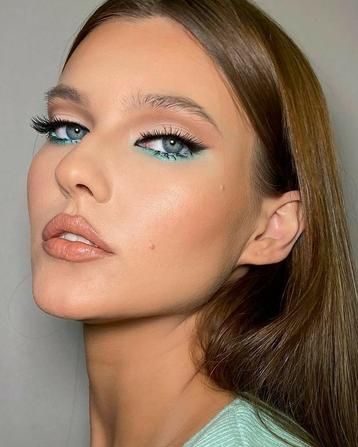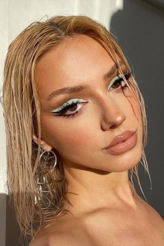 Dive into a refreshing summer aesthetic with eye makeup that brings out the oceanic tones in blue eyes. This look blends turquoise, green, and soft blues in a way that mimics the cool calm of water. A neutral base allows the vibrant accents to take center stage, making this style ideal for anyone looking to infuse life into their summer beauty look—perfect for quick transitions from beach days to night events.