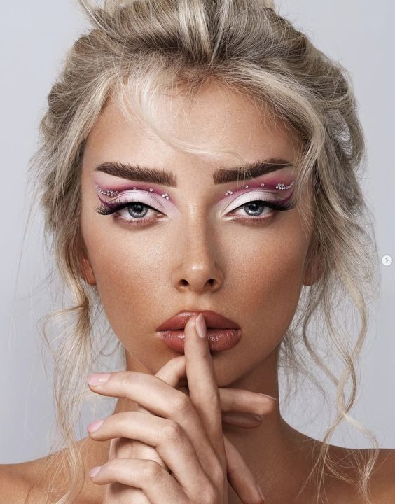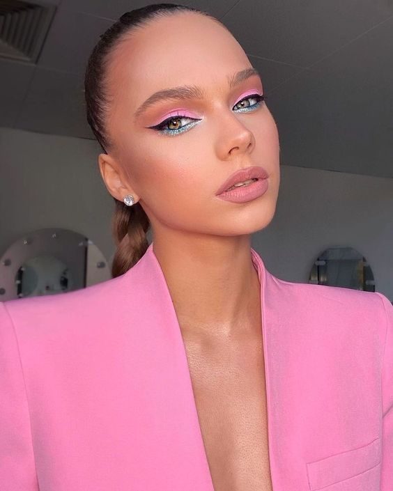 Turn your eye area into a canvas with pink and white graphic lines. This creative look celebrates individuality and modern art, showing that summer makeup can be expressive as well as beautiful. It’s ideal for those who see makeup as a form of self-expression and want to make a lasting impression.
