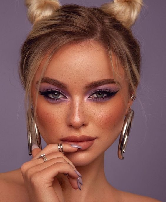 Inspired by the beauty of twilight skies, this look layers lavender, plum, and violet for a richly colored effect. The tones blend seamlessly and pair well with soft pink lips and glowy skin, making it an artful but wearable option for evening events.
