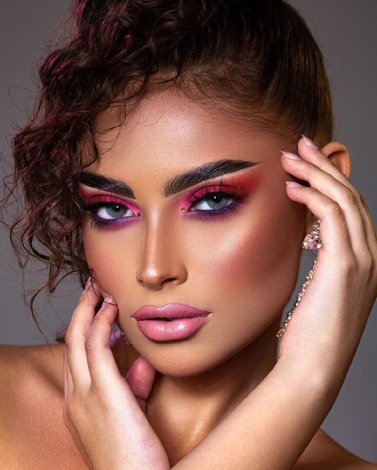 Celebrate the energy of summer with vivid pink and purple hues. This bold style pairs a pink blush tone with purple accents for an eye-catching statement. Soft winged liner and voluminous lashes frame the eyes naturally, allowing the bright colors to shine. It’s a fearless, confident choice for those who love to play with color and stand out in every summer setting.