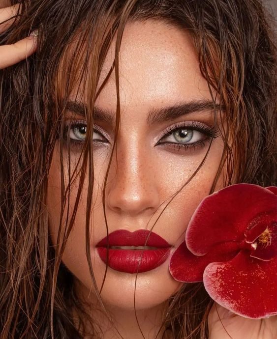 This look evokes the mystery of a tropical rainstorm with a glossy “wet” finish and dark smokey liner. Combined with bold red lips, it speaks to adventure and sensuality, making it a great choice for late-night summer escapades or romantic evenings.