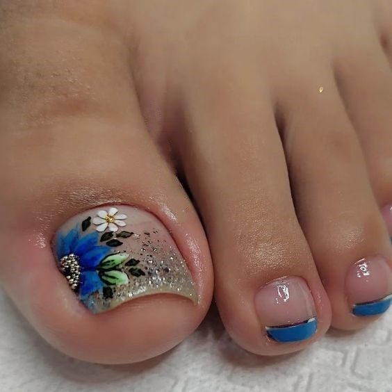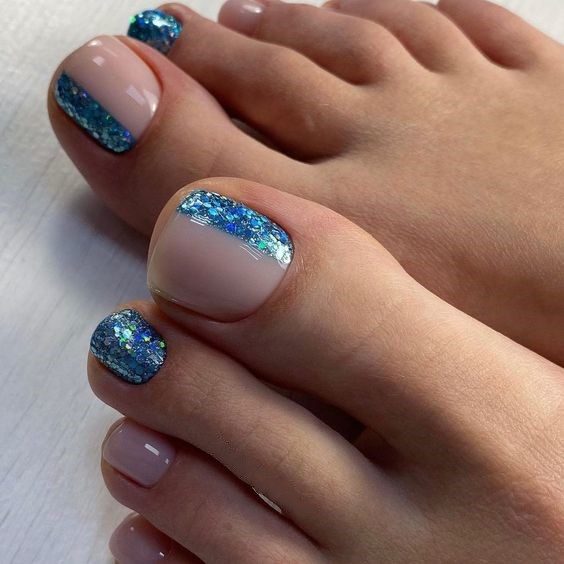 Like sunlight shimmering over ocean waves, this pedicure combines pastel pink with sparkling blue sequins for a dreamy, oceanic effect. The gradient shimmer reflects the mood of summer escapism and relaxation. Ideal for beach days, cruises, or spa weekends, it evokes the beauty of a coastal getaway in every step.