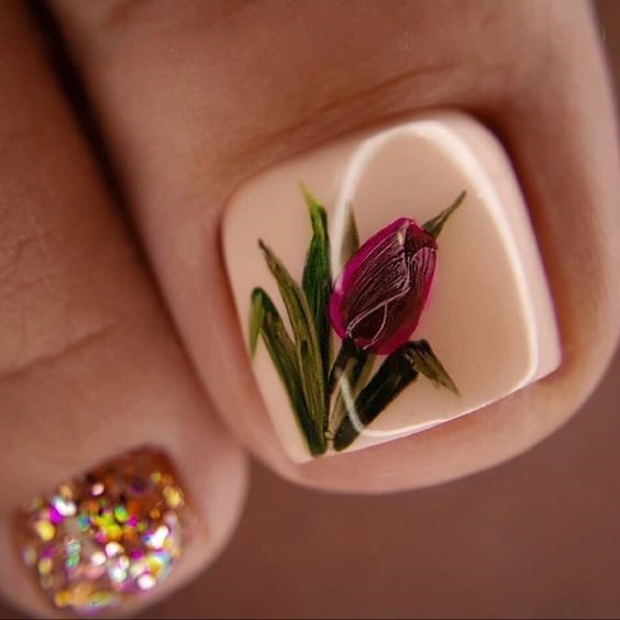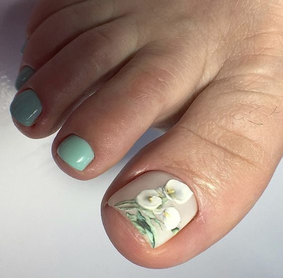 Embrace the essence of nature with this earthy green pedicure featuring delicate white florals and leafy accents. The translucent base creates a soft, natural look that blends beautifully with tan skin. It’s a romantic, grounded design that pairs perfectly with flowing dresses, woven sandals, and nature-inspired accessories.