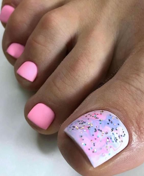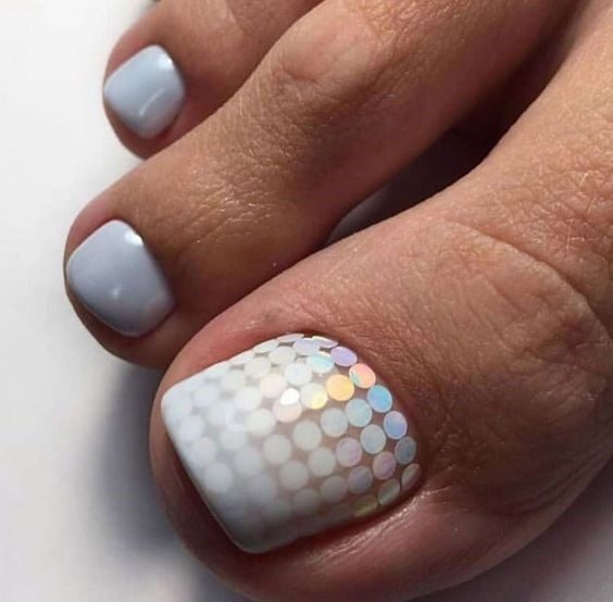 A pastel gradient sprinkled with colorful speckles creates a confetti-like effect that’s pure celebration. Reminiscent of carefree carnival days or ice cream truck visits, this pedicure is fun, cheerful, and full of personality. Ideal for pale skin, it adds a whimsical punch to everyday outfits while keeping things light and summery.