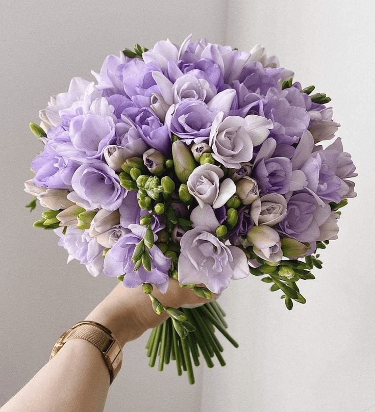 White and green bouquets take a lead in 2025 for brides who favor understated, nature-inspired elegance. This design features a graceful blend of white roses, lavender freesias, and soft greenery that together form a fresh, poetic statement. The airy palette highlights the beauty of minimalist design, making it ideal for a bride seeking white elegant wedding flowers with boho undertones. This bouquet pairs seamlessly with flowing lace gowns or simple chiffon dresses for spring garden or rustic outdoor ceremonies.