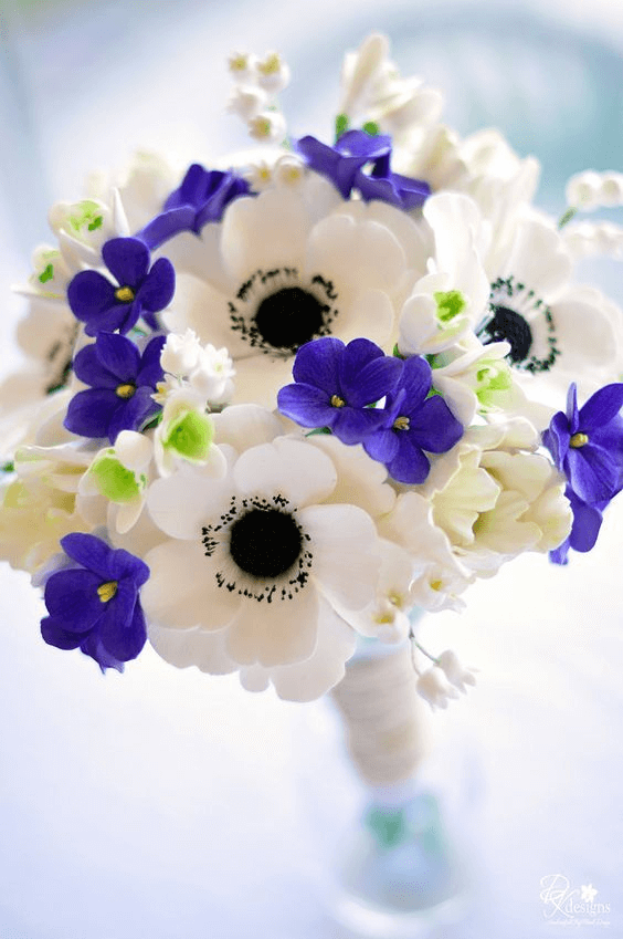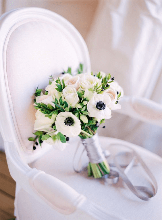 Striking white anemones with bold dark centers pair effortlessly with white roses and greenery, adding a whimsical and modern twist to the traditional bouquet. The contrast of dark and light is dramatic yet balanced, perfect for brides who want elegance and edge in one floral arrangement. Ideal for minimalist, garden, or modern winter weddings.