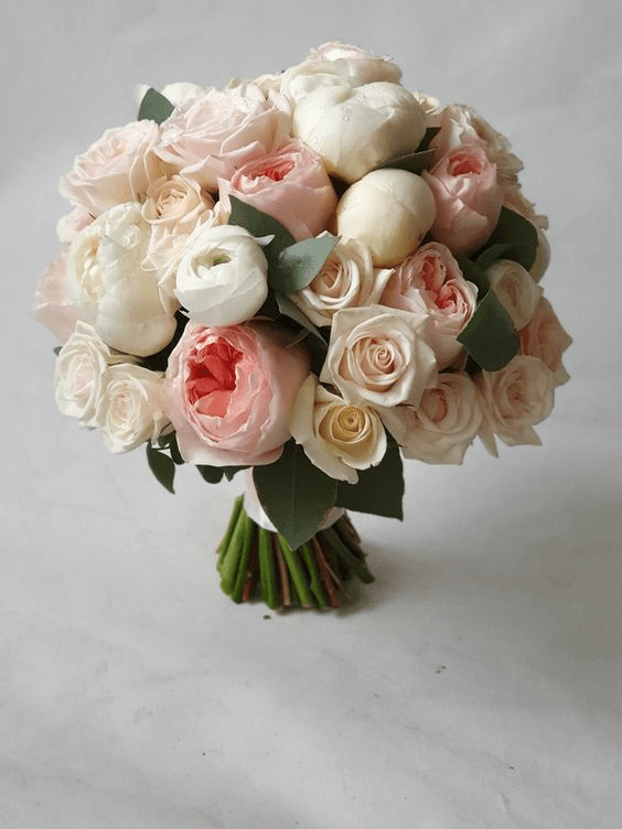 Soft blush pinks meet creamy whites in this romantic reimagining of the classic rose bouquet. The arrangement features round blooms surrounded by greenery, bringing depth and organic movement to the overall look. The result is a refined yet natural bouquet that fits beautifully with a white elegant dress or boho-chic bridal aesthetic.