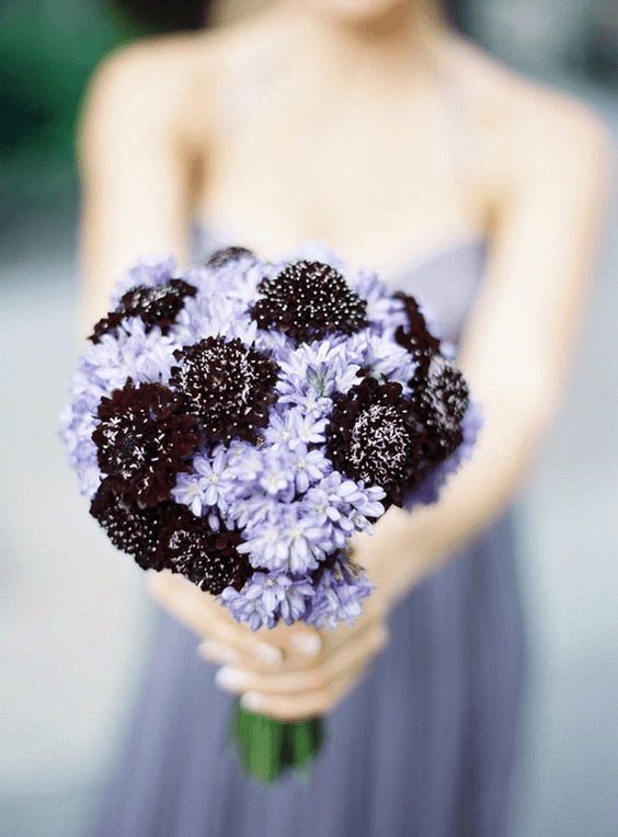 A captivating monochromatic bouquet composed of rich purple blooms. This arrangement, ideal for fall or winter weddings, exudes moodiness and sophistication. For the bride enchanted by jewel tones and evening elegance, it offers a dramatic flair that still remains tasteful and timeless.
