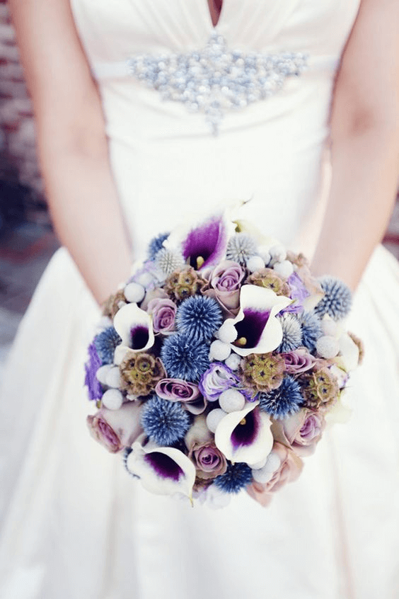 A bouquet for the bride who craves something unique—this design artfully fuses rustic charm with elevated sophistication. Purple roses, blue thistles, white calla lilies, and juicy green succulents compose a one-of-a-kind arrangement. The bouquet embodies rustic boho beauty while still maintaining an elegant core, perfect for creative brides who want to express their individuality with every petal.