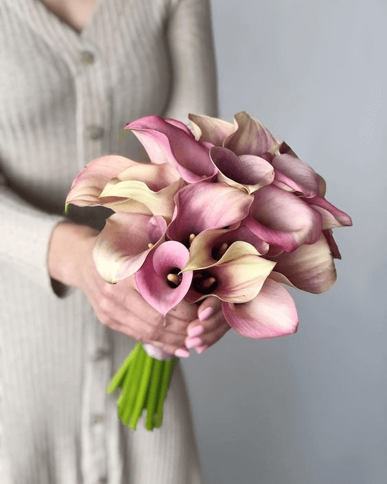 Cascade bouquets return in 2025 with dramatic flair. This design features a gradient of calla lilies, fading from deep fuchsia to pale cream, evoking sophistication and romance. The flowy shape complements a white elegant gown, while the contrast of bold and light tones brings effortless movement and charm. It’s an ideal bouquet for the bride who appreciates structure but longs for natural softness.