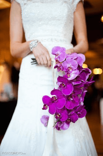 A showstopper bouquet for the bride who embraces luxury and sensuality. This cascading arrangement features vibrant purple orchids that exude opulence and refinement. Paired with a white elegant gown, the dramatic florals provide a high-contrast look perfect for grand venues, garden weddings, or luxe boho events.