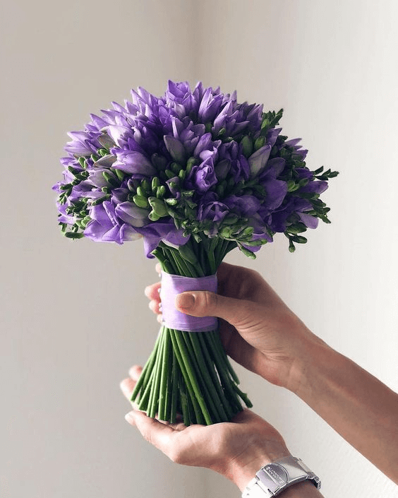 For brides who love purple but desire simplicity, this bouquet offers a cohesive look in lush lavender tones. The monochromatic style is clean yet rich, perfect for minimalist brides who still want color impact. It’s a lovely choice for spring or summer celebrations, adding a luxurious feel to the bridal ensemble.