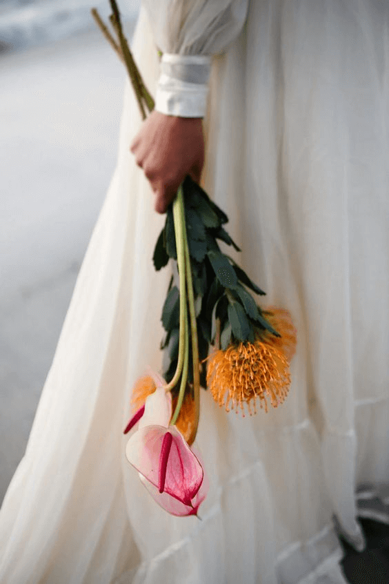 Orange and white tropical-inspired blooms create this striking bouquet. The distinctive shapes and saturated hues bring an exotic flair to an otherwise simple design. Perfect for destination weddings or brides seeking something offbeat yet graceful.