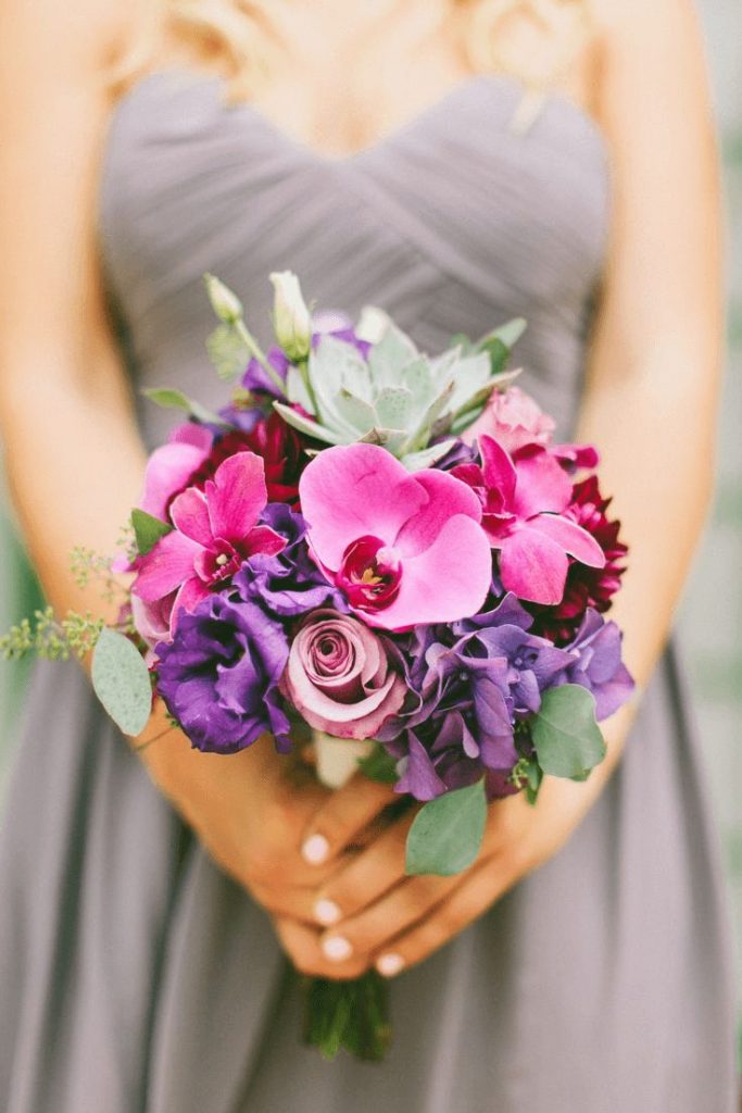 For brides who love rich, expressive hues, this bouquet blends deep purples, magentas, and pinks with wild elegance. Purple orchids, pink roses, and accent blooms create a vibrant contrast that speaks of joy and celebration. This dynamic arrangement is perfect for the bride whose personality is as bold and vivid as her wedding day, bringing color to rustic, boho, or even luxe urban themes.