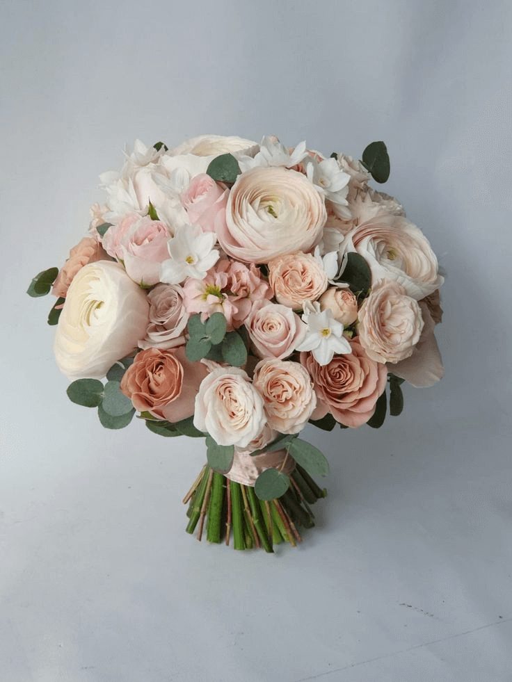 The essence of gentle femininity comes alive in this pastel-toned bouquet, featuring soft blush roses, creamy peonies, and trailing eucalyptus. It exudes a romantic, white elegant feel with a fresh, modern simplicity. This arrangement is perfect for a bride seeking a small bouquet with a neutral aesthetic for a fall wedding or a light spring gathering. The pastel pink hues offer timeless appeal, blending traditional design with a soft, graceful boho touch.