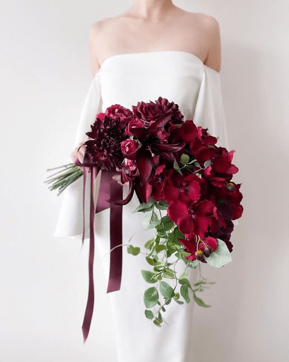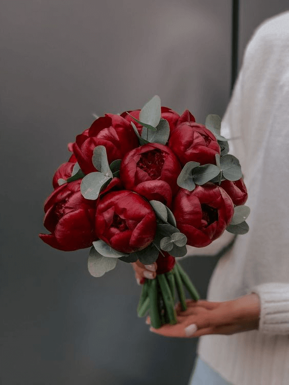 For the bride who draws beauty from minimalist tradition, a bouquet of burgundy tulips and roses with accents of silver-toned greenery captures the serenity of winter whites and deep jewel tones. This floral arrangement is effortlessly elegant and timeless, aligning perfectly with modern wedding styles that feature white, green, or cool-toned palettes like navy and blue.