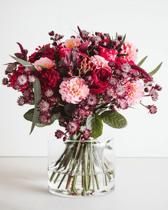 A wedding table becomes a scene of refined beauty with a centerpiece that celebrates color harmony. Burgundy blooms, paired with delicate pink dahlias, stand tall in a crystal-clear vase. Each flower is artfully positioned, allowing their stems to create visual depth. This design works effortlessly with navy, blush, and purple wedding color schemes, offering a sophisticated and inviting ambiance for guests.