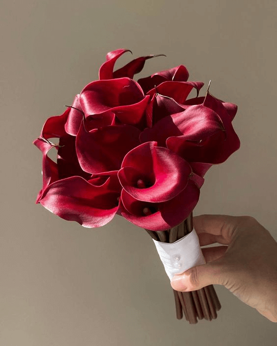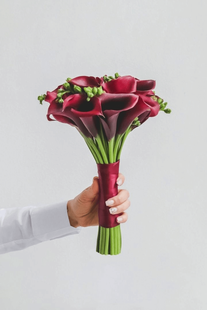 In spring’s gentle embrace, the bridal bouquet becomes an extension of the bride’s radiance. Here, calla lilies in a deep burgundy hue unfurl with the grace of satin. Tied together with an ivory ribbon accented by pearls, this arrangement is a nod to classic bridal refinement. Hints of blush pink and creamy tones softly balance the richness of burgundy, creating a bouquet that evokes timeless romance—ideal for brides who adore understated charm with a luxe twist.
