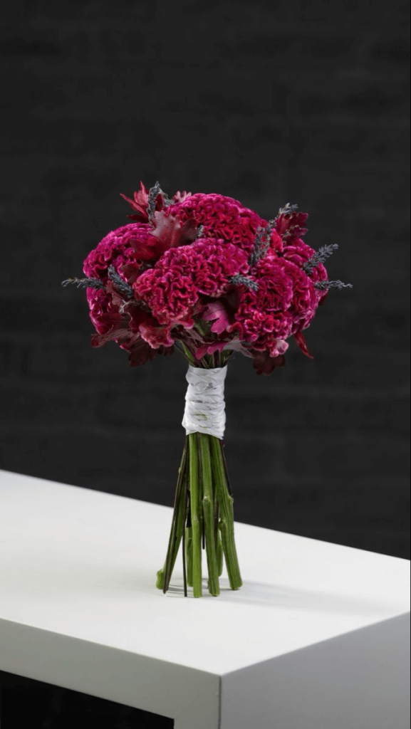 Tactile beauty defines this floral design, blending ruffled celosia with layers of burgundy flora. Texture becomes the star, with every bloom carefully selected to deliver visual interest. Placed against a clean, minimalist backdrop, this bouquet shines with artistic contrast. It’s perfect for avant-garde weddings or brides looking to incorporate blue and grey hues into their aesthetic.