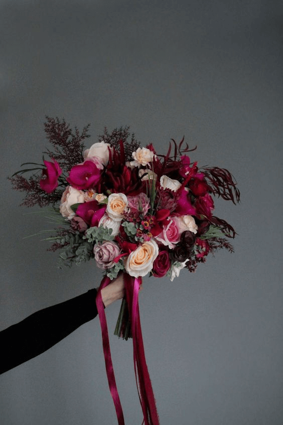 As dusk approaches and candles flicker, a bridal bouquet emerges like a dream. Burgundy, mauve, and dusty roses mingle in a bouquet bound by long flowing satin ribbons. This moody, romantic arrangement is perfect for an evening or winter wedding, capturing the quiet magic of twilight and the intimacy of candlelit vows.