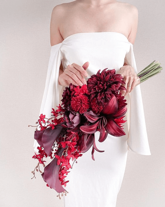 High in the hills, where wind kisses mountaintops, a free-spirited bride holds a cascading bouquet that flows like a floral waterfall. Burgundy and bright pink blossoms tumble gracefully amid green vines and wild textures. With a touch of rustic elegance and a nod to the richness of fall color schemes, this bouquet speaks to nature-loving brides planning an outdoor or early autumn wedding ceremony with an adventurous heart.