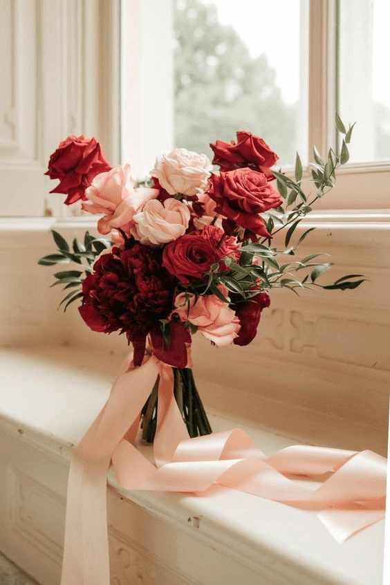 This lively bouquet blends bold burgundy and cheerful pink blossoms, accented with fluttering ribbons that dance in the spring breeze. Perfect for couples embracing joyful celebration, it radiates a spirit of love, passion, and excitement. Whether used as a bridal bouquet or a reception centerpiece, it reflects a vibrant and heartfelt wedding atmosphere.