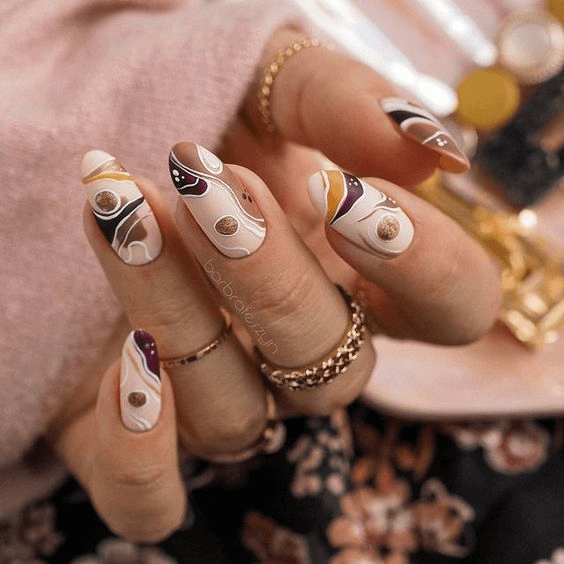 This design highlights Capricorn’s refined taste through a palette of creams, browns, and purples with gold accents. Long acrylic nails become art pieces that blend modern design with timeless aesthetics. It’s a look that seamlessly transitions from office wear to evening sophistication.