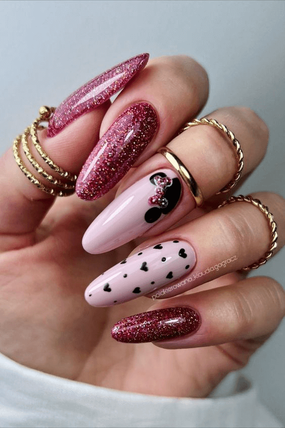 For the bold and graceful Capricorn baddie, this look combines edgy sophistication with soft femininity. The interplay of matte and gloss textures across pink and black stiletto nails creates visual intrigue, while a jeweled bow detail adds a whimsical, feminine twist. This style speaks to confidence, flair, and birthday glamour for the woman who owns every room she enters.