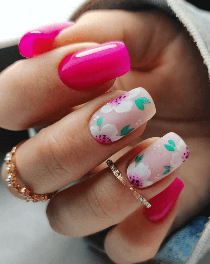 Rooted in Capricorn’s earthy essence, this romantic floral design balances vivid magenta with sheer pink. Featuring delicate blooms, it channels the early blossoms of spring. Ideal for long acrylic nails, this style pairs effortlessly with flowy dresses and outdoor celebrations, evoking nature’s elegance for birthday brunches or garden soirees.