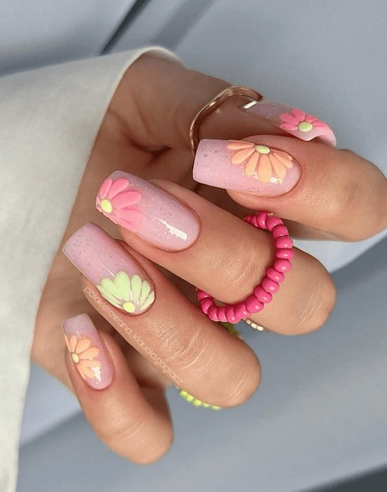 Soft pastel pinks and mellow yellows merge in this serene floral design. The long acrylic nails are painted like a blooming spring garden, making them ideal for calm and reflective Capricorns. It’s a delicate, symbolic set perfect for celebrating personal growth or springtime beginnings.