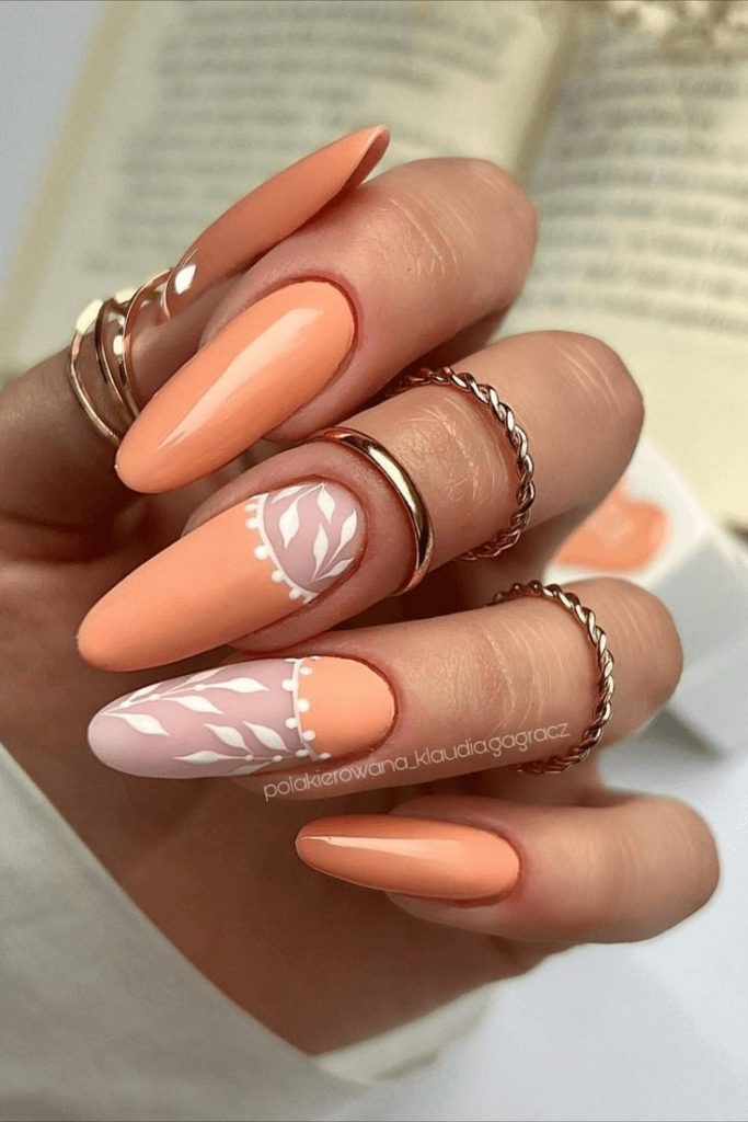 Delicate white lace-like detailing on a soft peach base creates a romantic look that celebrates femininity. Pointed long acrylics enhance the modern silhouette, making this design perfect for young Capricorns celebrating 18th or 21st birthdays with refined flair.