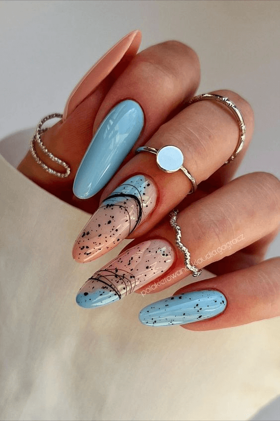 A soft, cloudy pastel palette captures the dreamy side of spring. These long acrylic nails echo a serene sky with their breezy, abstract finish. A perfect pick for daytime outings, quiet birthday reflections, or soft-toned spring wardrobes.