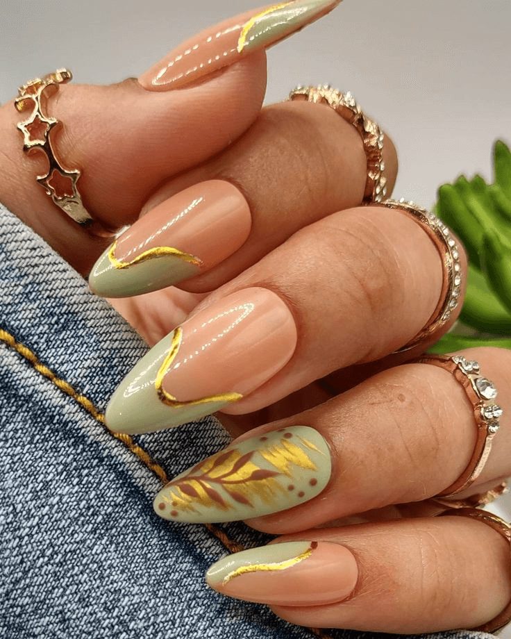 Earthy tones serve as the foundation for golden shimmer in this almond-shaped long acrylic set. The design is both grounded and glamorous, ideal for Capricorns who prefer soft elegance and understated shine on their special day.