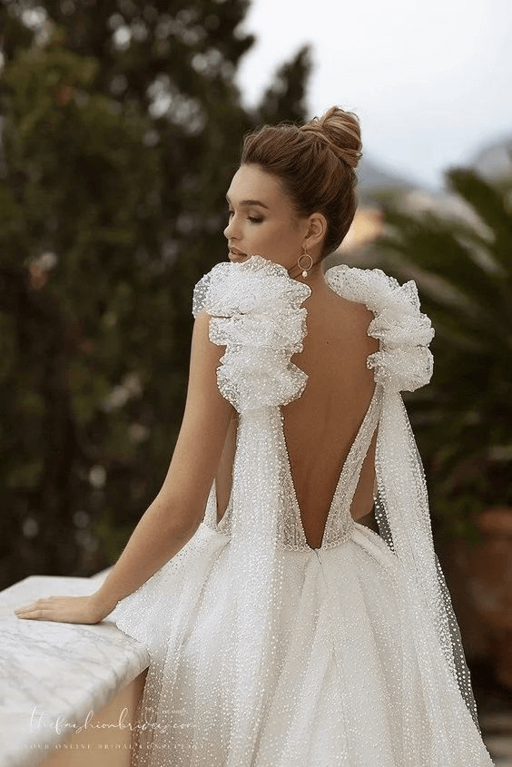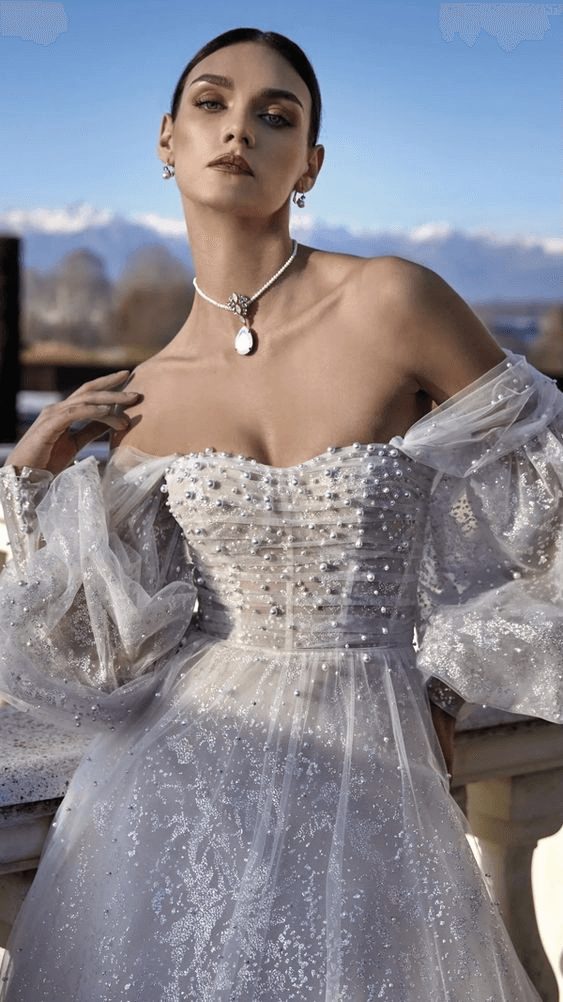 This dress whispers old-world charm with puffed sleeves and an open back adorned in delicate beading. The skirt, a blend of sequins and soft tulle, makes a classy statement—marrying 2025’s love for intricate texture with an enduring silhouette.