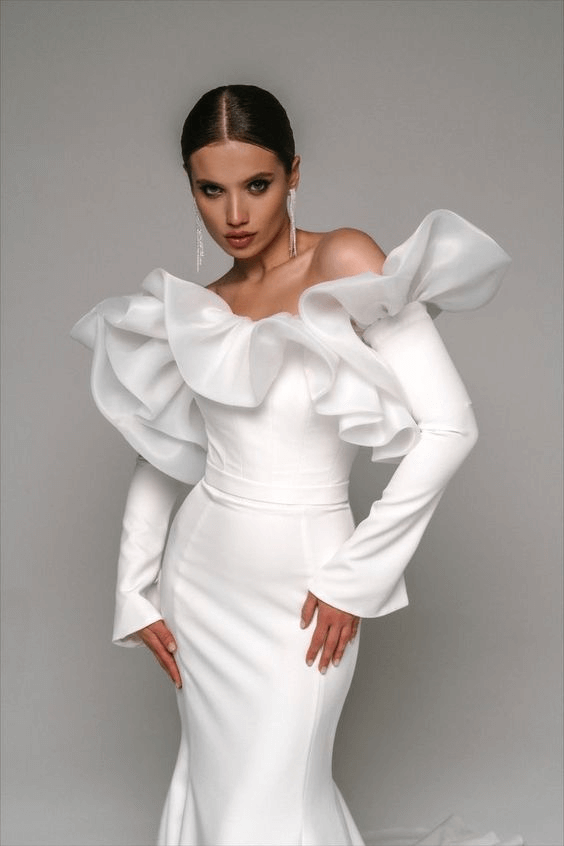 For the bride who loves dramatic style paired with elegance, this gown redefines tradition. Long sleeves bloom into extravagant ruffles, leading to a sleek figure-skimming skirt. It perfectly marries modern elegance with vintage allure—ideal for a grand ceremony or an eloquent courthouse event.