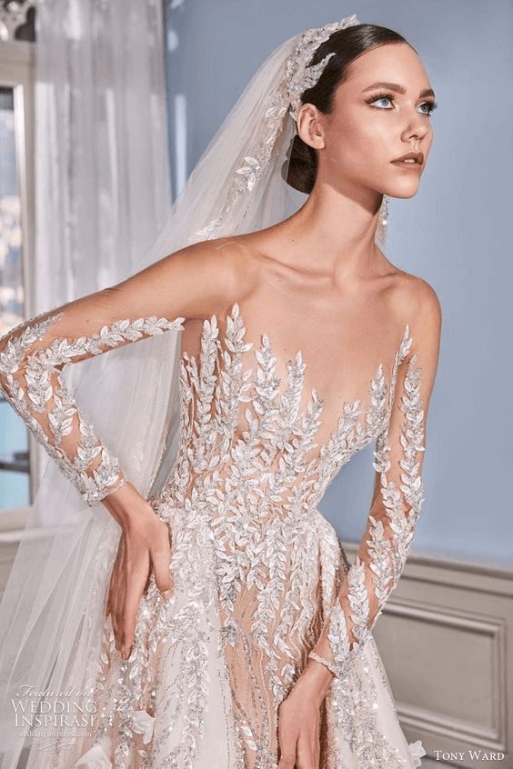 Floats like a cloud, this gown features sheer long sleeves and intricate lacework inspired by bohemian and vintage trends. With delicate leaf-like embroidery, it’s a forest fairytale perfect for outdoor ceremonies or romantic garden celebrations.