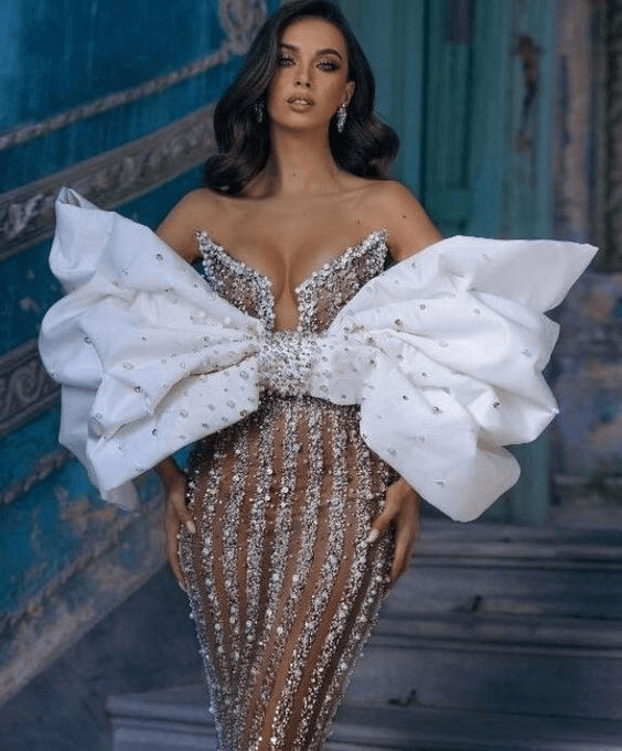 This gown blends the 2025 trend of modern style with timeless elegance. Featuring a dramatic bow atop a sequined, figure-hugging skirt, the contrast between simple classy white and intricate sparkle offers a fresh take on vintage aesthetics. Ideal for a bold, fashion-forward bride.