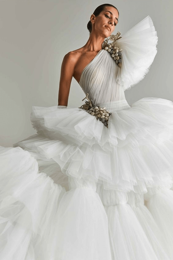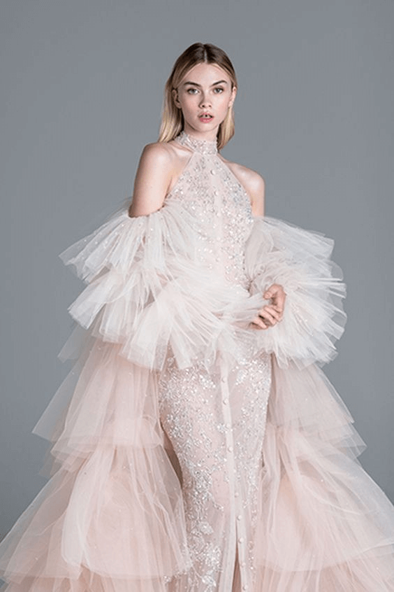 Capturing the dance between vintage and modern minimalism, this gown is a dream in soft tulle and sparkling beads. A high neck and full, layered skirt—with a subtle blush hue—echo classic ballet, perfect for brides who adore simple elegance with dramatic flair.