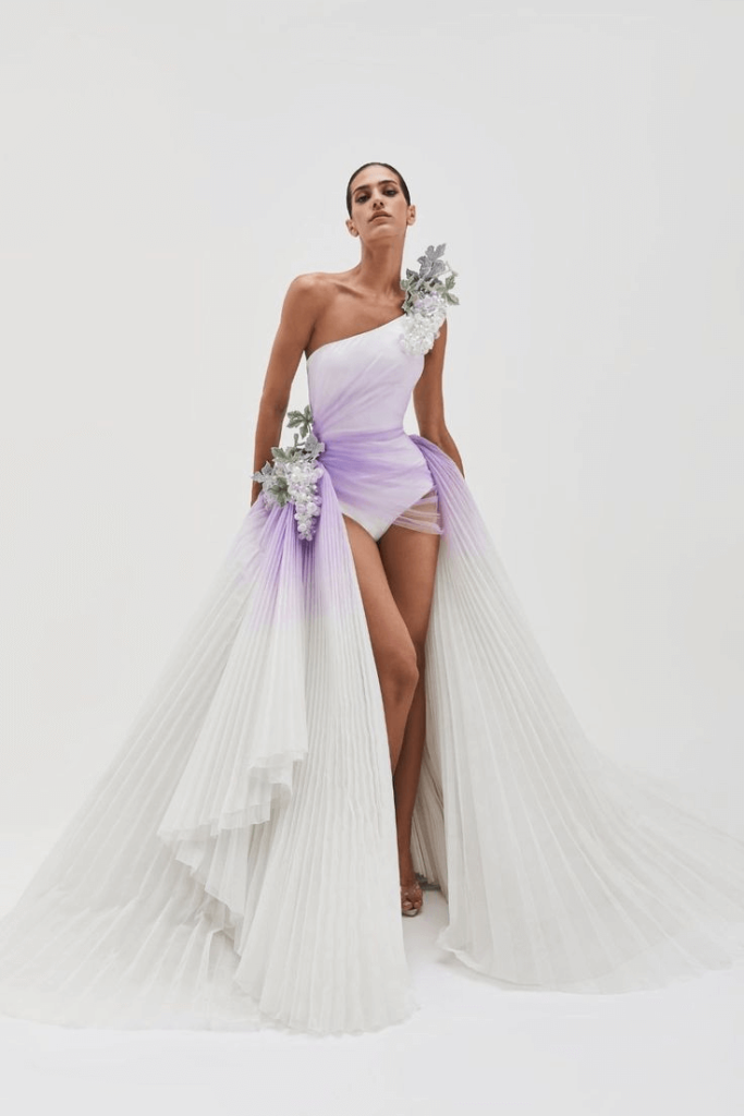 Imagine walking down the aisle in a classy yet modern gown that combines sheer fabric with delicate floral appliqués. This dress, capturing the 2025 bridal trend, features a structured sheer bodice with strategically placed flowers that hint at skin while exuding sophistication. Its soft, ethereal skirt balances the look, perfect for the bride with a modern-simple aesthetic who treasures contemporary beauty.
