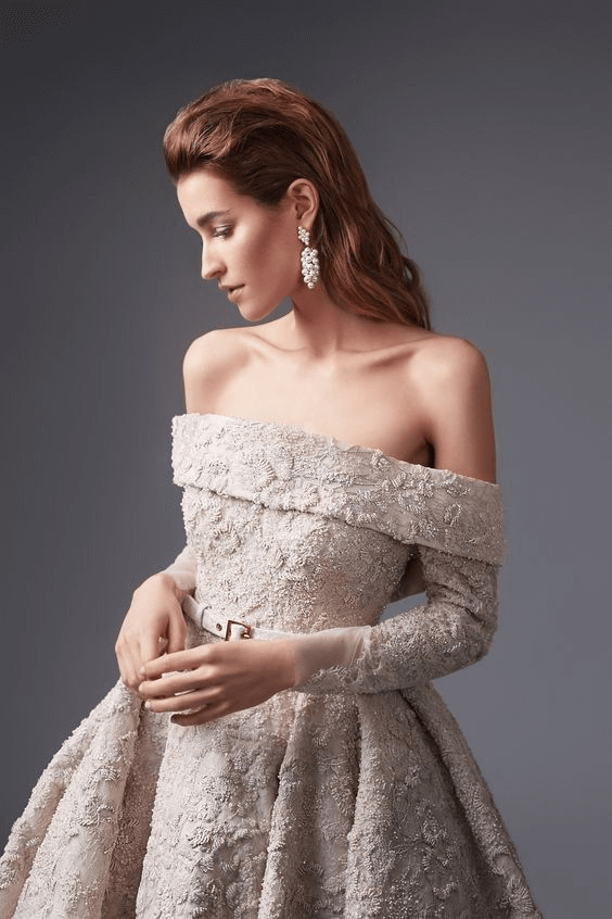 An off-the-shoulder gown with a beaded bodice and luxurious lace sleeves, this dress captures modern elegance while embracing vintage texture. It’s perfect for brides who love ornate detail and rich fabrics in a classy, sophisticated silhouette.