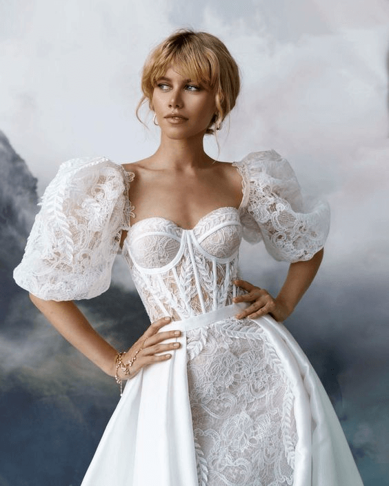 This gown blends modern corsetry and romantic puff sleeves—two tonal styles that balance structure and femininity. It epitomizes simple elegance with bohemian flair, ideal for refined brides embracing whimsical design.