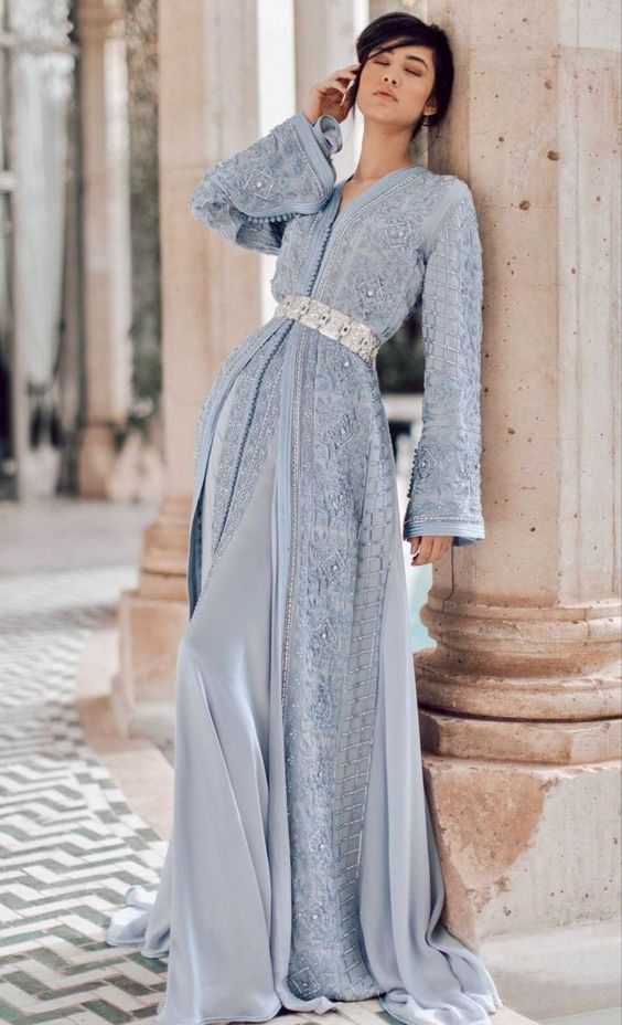 Arab weddings are known for their grandeur, so lean into it with a classy gown that’s rich in detail. Floor-length dresses with golden embroidery or beaded accents feel festive yet elegant. Fabrics like silk or satin drape beautifully and catch the light as you move. Pair with chandelier earrings and a sleek hairstyle for an effortlessly regal vibe.