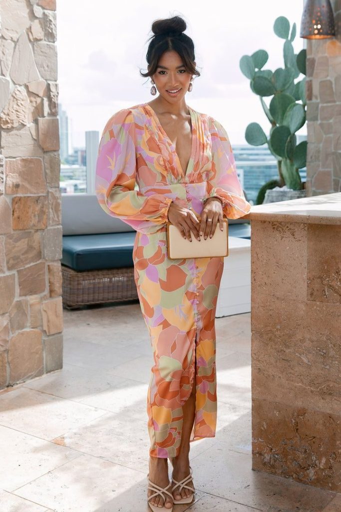 A summer casual beach wedding calls for comfort and charm. Lightweight dresses in cotton or linen keep you cool, while soft floral prints add a romantic touch. Try a maxi dress with a side slit or a flowy sundress that pairs perfectly with flat sandals and beachy waves. Add a sun hat and woven bag to complete the look.