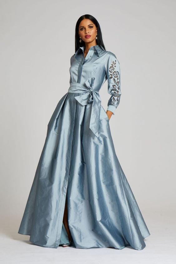 When fall comes around, don’t be afraid to stand out with rich, bold colors and standout cuts. A deep emerald or burnt orange gown with dramatic sleeves or a flowing cape makes a show-stopping statement. Keep accessories earthy and elegant — think gold bangles or gemstone earrings — to tie it all together.